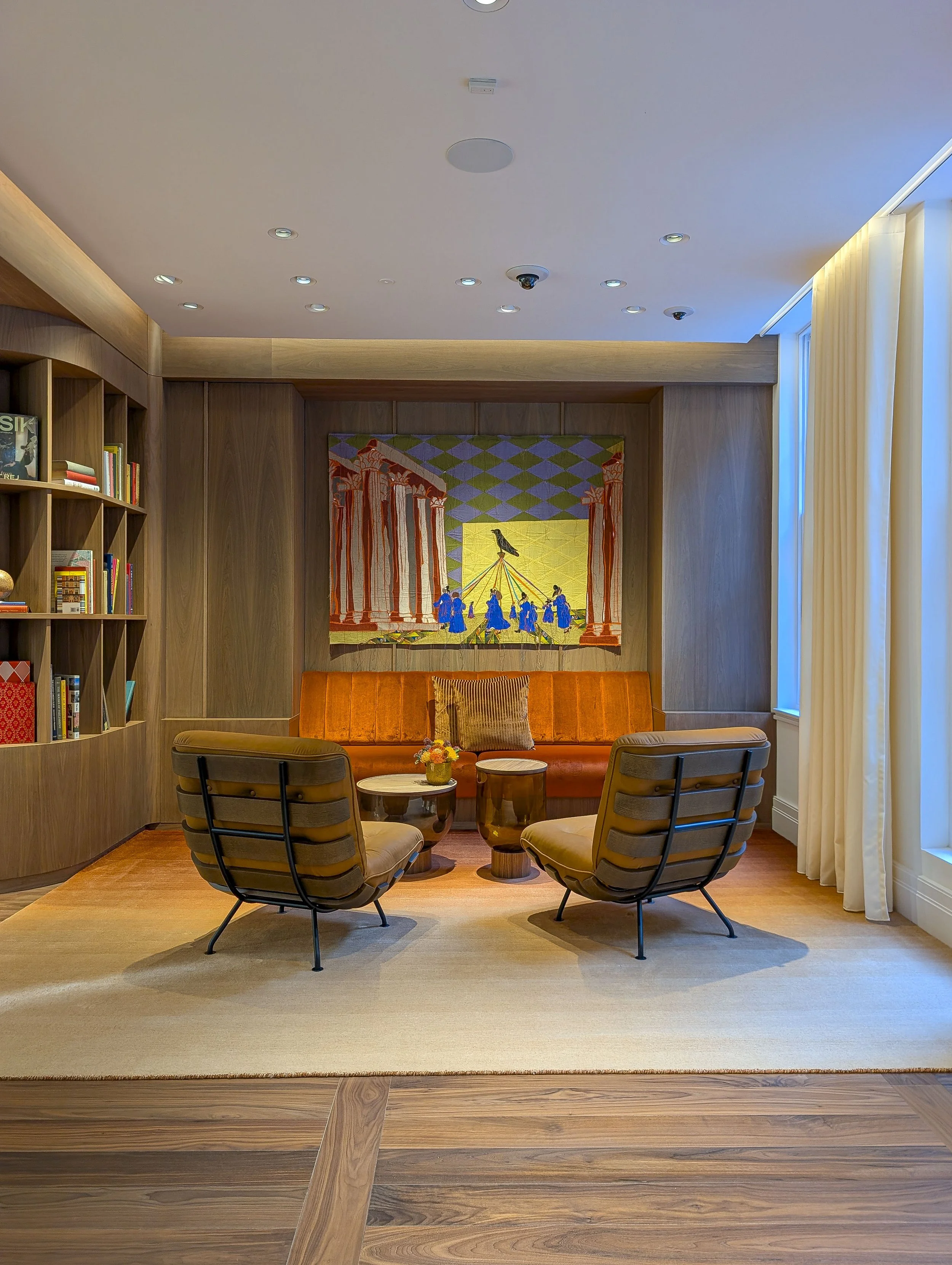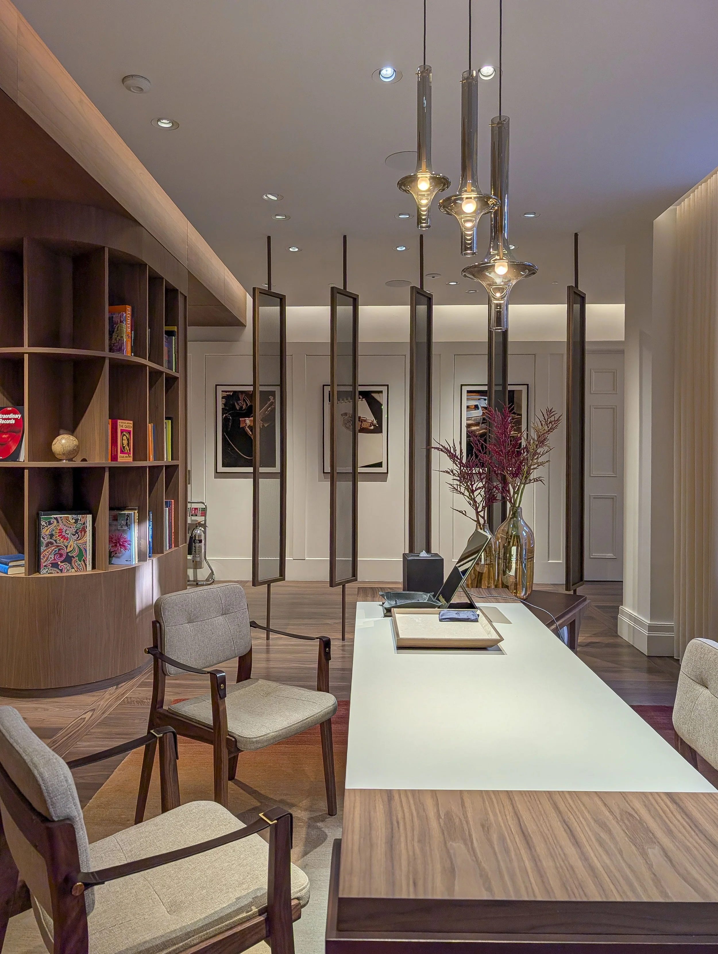 A key challenge of this project was the installation of artworks onto delicate surfaces, including walnut veneer panelling and bespoke fabric-covered walls. These materials require a specialist approach.