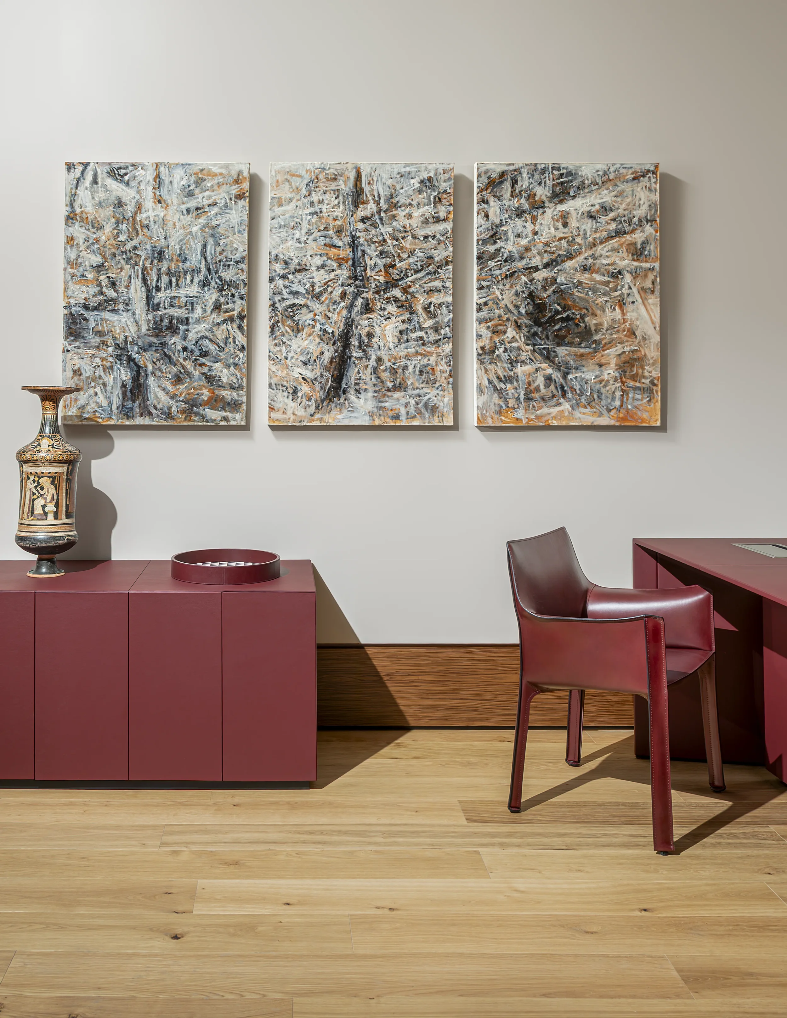 Nick Vinson’s vision for Casa Italia blended classical warmth with contemporary utility, bold colour narratives and architectural coherence. Upper-floor offices are defined by chromatic themes in red, yellow, green and blue, demanding careful calibration of artwork height and positioning to harmonise with wall tones and bespoke furniture.