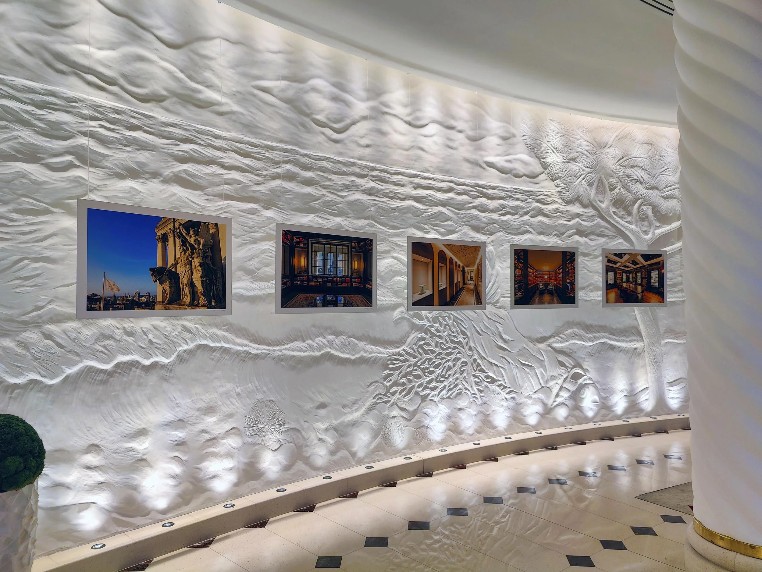 The rotunda presented a unique challenge: the walls feature intricate plaster carvings, which prevented standard methods of hanging artworks. This required a custom installation solution that would preserve the architectural integrity of the space while showcasing the photographs elegantly.